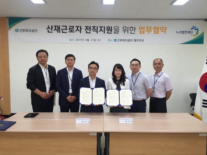 노사발전재단 제주중장년일자리희망센터와 근로복지공단 제주지사는 21일 오전 10시, 근로복지공단 제주지사에서 제주지역 산재근로자 전직지원을 위한 업무협약을 체결했다고 밝혔다.