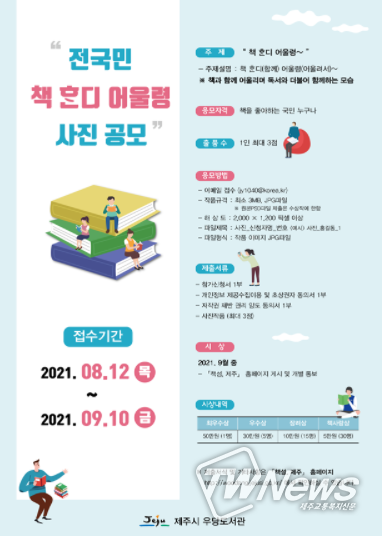 [제주교통복지신문 김지홍 기자] 제주시 우당도서관은 제주독서대전을 널리 홍보하고 책과 함께 나눌 수 있는 독서문화의 장을 마련하고자 『책 ᄒᆞᆫ디 어울령』 전 국민 사진 공모를 실시한다고 밝혔다.