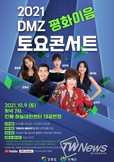 [제주교통복지신문 김지홍 기자] 강원도는 10월 9일 인제군 하늘내린센터 대공연장에서 ‘2021 DMZ 평화이음 토요콘서트 인제’를 개최한다.