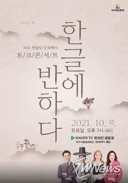 저녁 7시부터는 여주세종문화재단 네이버TV를 통해 한글날 토크콘서트 ‘한글에 반하다’가 생중계로 진행된다. 한글의 과거와 현재 미래라는 주제로 훈민정음 창제 당시의 역사적 궁금증들을 해소하고 현시대 외국인들의 한글사랑을 통해 현주소를 조명한다. 또한 신세대와 기성세대가 쓰는 한글의 재미있는 대화를 통해 한글이 나아가야 할 방향을 이야기 해보고 한글을 쓰는 자국민으로 자긍심을 높이는 시간으로 진행된다.