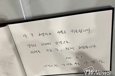 [포토뉴스] 나경원 후보, 제주4·3평화공원에서 방명록 작성