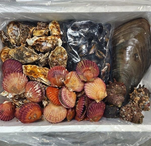 싱싱한 자연산 당일조업 홍합(800g내외), 뿔소라(400g내외), 홍가리비(700g내외), 석화(2kg내외), 키조개 (700g내외)로 중2kg 대4kg로 구성된 제품이다.
