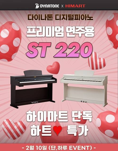 [제주교통복지신문 박상현 기자] 종합악기 전문 브랜드 다이나톤(대표 도상인)은 2월 10일(금) 0시부터 24시간 동안 프리미엄 연주용 디지털피아노 ST220을 최대 41% 할인하여 판매하는 하이마트 하트 특가 행사를 진행한다고 밝혔다.