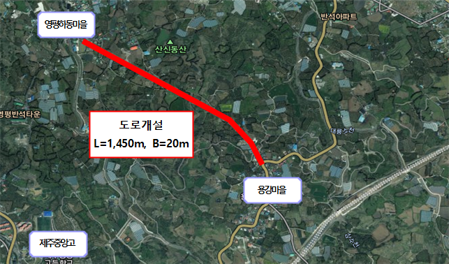 영평하동과 용강동 일대 마을안길의 협소함을 해소하기 위해 지난 2011년 12월 착공한 해당 도로는 그간 보상협의 지연 및 예산확보 어려움등으로 인해 8년여를 끌어오다가 최근 제주시가 사업마무리를 위한 잔여예산 26억원을 확보 완료함으로써 올해 안으로 공사를 마무리할 수 있게 될 전망이다.