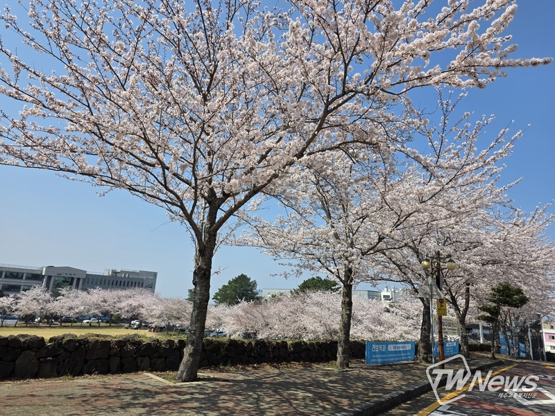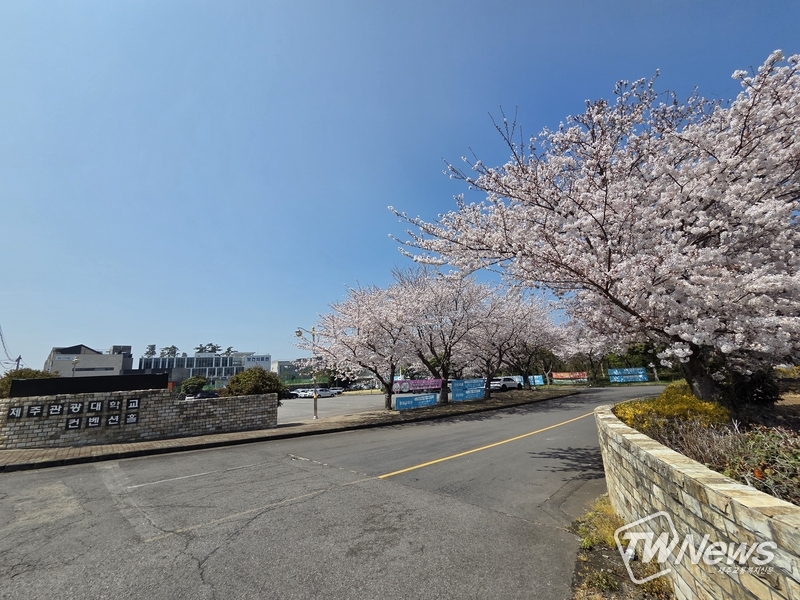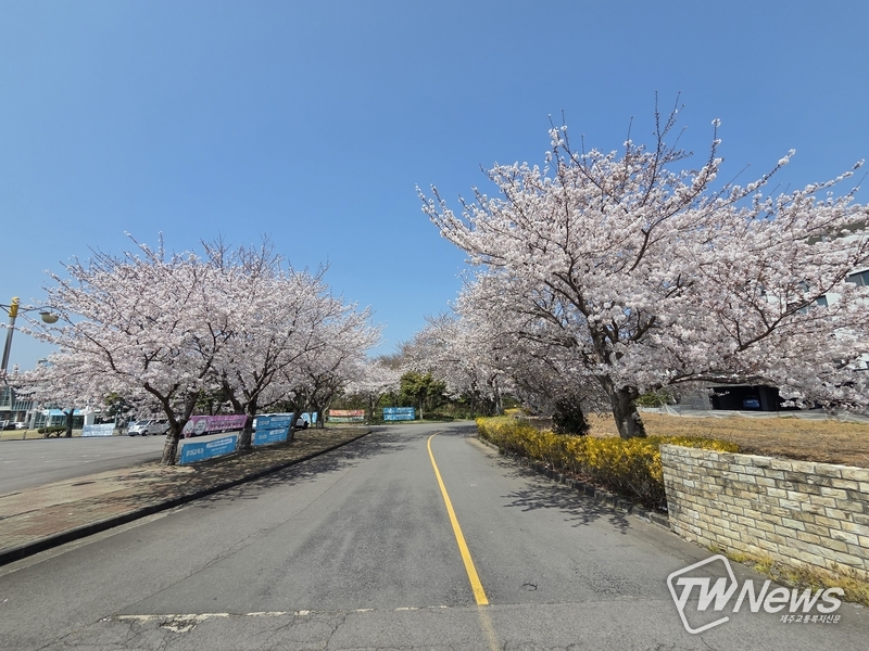 제주시 제주관광대학교 캠퍼스 일대에 벚꽃이 만개해 봄 정취를 더하고 있다. 도로를 따라 이어진 벚나무들이 흐드러지게 꽃을 피우며 방문객과 학생들의 발길을 모으고 있다. (사진=이문호 기자)