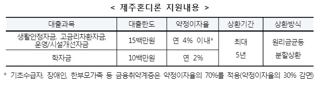 제주혼디론 대출은 긴급 생활비 및 의료비, 임차보증금 등 생활안정자금, 고금리 대출을 저금리로 차환하기 위한 자금, 학자금 대출 등을 1인당 최대 1,500만원 이내로 금리 연 4.0% 이내(학자금 2%), 5년 이내 원리금 균등 분할 상환 조건으로 운영되고 있다.