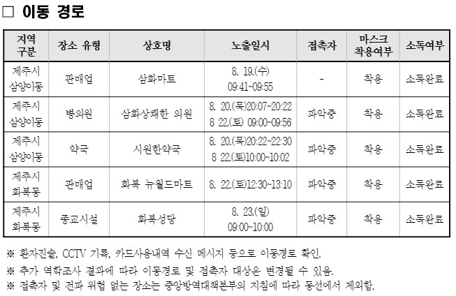22일 오전 9시 37분부터 9시 55분까지 도련1동 소재 삼화상쾌한 의원을 방문했고, 접촉자는 파악 중에 있다.