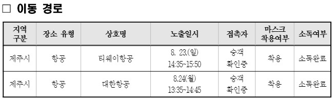 제주도는 A씨가 이용한 항공기 탑승객을 조사하는 한편, 현장 역학조사와 CCTV·카드사용 내역 분석 등을 통해 상세 동선과 접촉자 정보들을 추가로 확인 중이다.