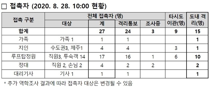 제주도는 A씨와 접촉한 27명 중 24명의 신원 파악을 완료했고, 나머지 3명(루프탑정원 투숙객 1명, 정대 손님 2명)에 대한 신원 파악에 주력하고 있다.