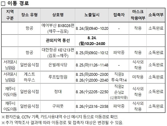 A씨가 방문한 장소는 △은빌레식당(서귀포시 남원읍, 접촉자 없음) △루프탑정원(남원읍, 직원 3·‧투숙객14명) △정대(제주시 이도2동, 직원2·손님 2명 신원 파악 중) △구피풋(이도2동, 접촉자 파악 중)이다.