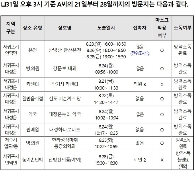 A씨는 제주 29·33번 확진자인 목회자 부부가 산방산탄산온천을 방문한 지난 23일 오후 4시경 온천을 방문했다.