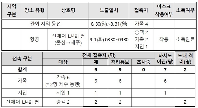 2일 오후 4시 기준 역학조사 결과, A씨는 1일 오전 8시 30분 울산발 제주행 진에어 LJ491편을 통해 오전 9시 30분경 입도했다.