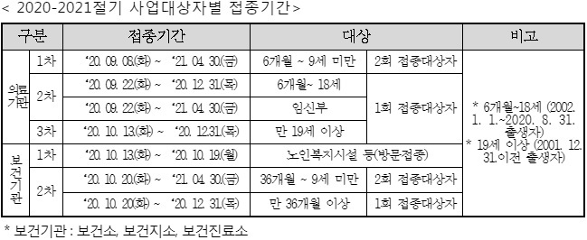예방접종 일정을 보면 △2회 접종대상자(만9세 미만의 인플루엔자 접종력이 없는 경우)는 9월 8일 △1회 접종대상자(어린이)와 임신부는 9월 22일 △만19세 이상은 10월 13일부터다.