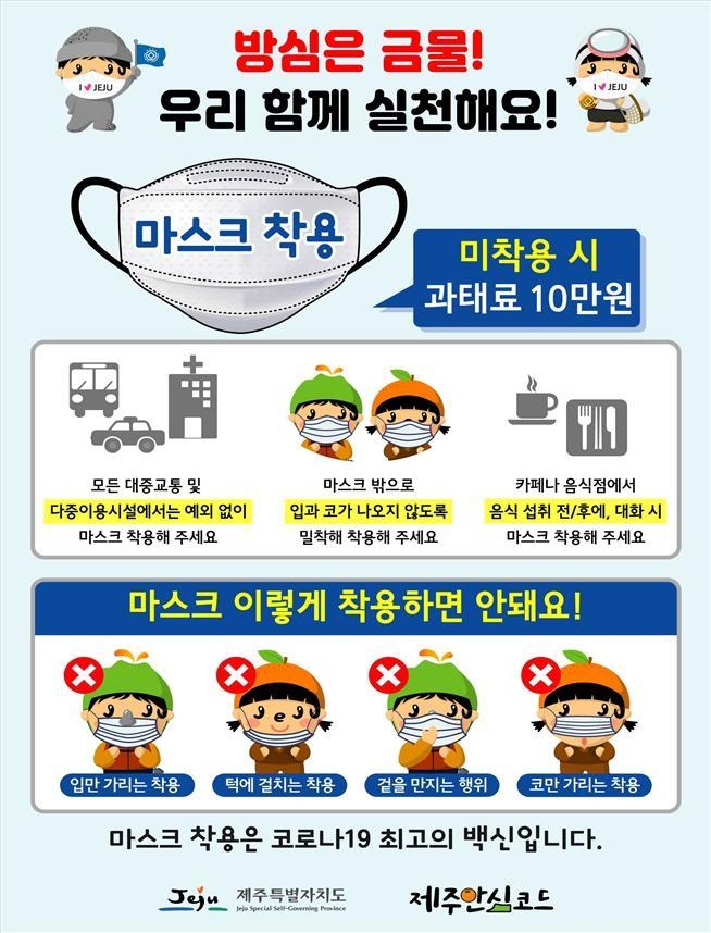 제주도는 13일 0시부터 마스크 착용이 의무화된 도내 55개 업종(붙임자료-하단 참고 1)내 마스크 미착용 등 방역수칙 위반 시 10만원의 과태료를 부과한다고 밝혔다.