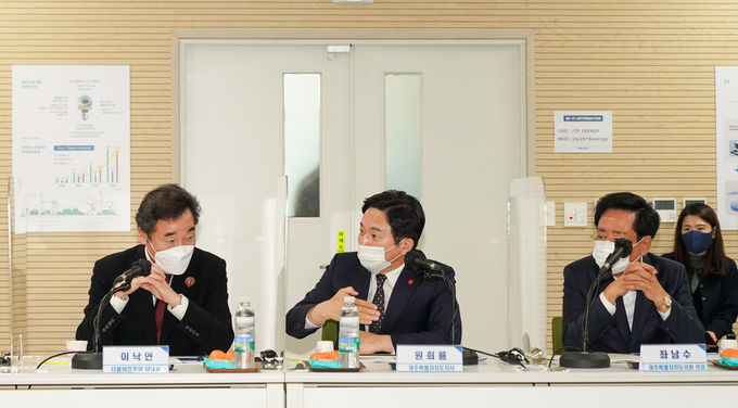 원희룡 지사는 이날 오후 2시 전기차배터리산업화센터에서 이낙연 더불어민주당 대표를 비롯한 중앙당 최고위원 및 당직자들이 참석한 가운데 전기차배터리산업화센터의 운영상황 및 2030 탄소 중립 섬을 위한 제주도의 주요 정책들을 소개했다.