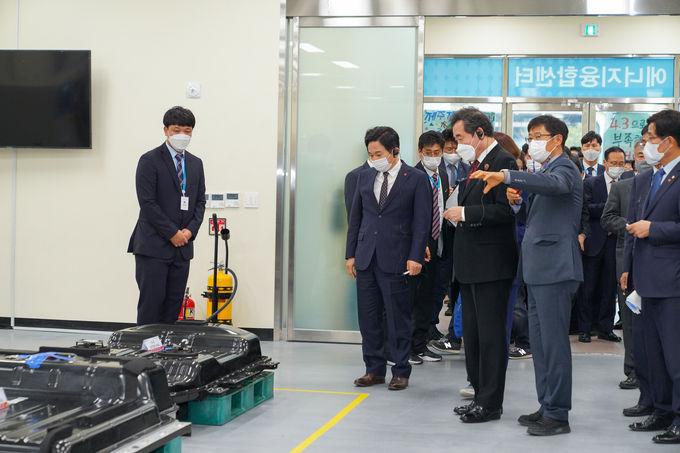 원희룡 지사와 이낙연 대표 등 민주당 지도부는 전기차배터리산업화센터 내부를 시찰하며 폐배터리를 재사용하는 과정과 재사용 배터리가 활용되고 있는 다양한 제품들을 직접 확인했다.