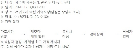 경매 참여 희망자는 12월 3일 서귀포시 축협 가축시장(남원읍 수망리 소재)을 방문해 공개경매 절차에 따라 응찰하면 된다.