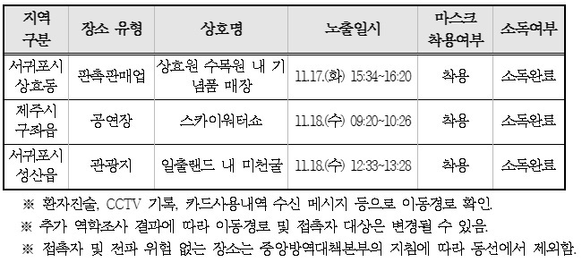 제주도가 27일 추가로 공개한 동선은 ▲상효원 수목원 내 기념품 매장(11.17. 15:34~16:20) ▲스카이워터쇼(11.18. 09:20~10:26) ▲일출랜드 내 미천굴(11.18. 12:33~13:28) 3곳이다.