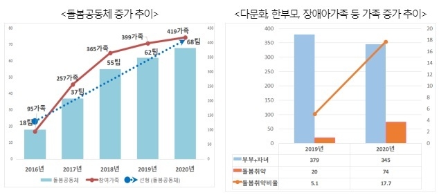 돌봄 공동체인 경우 2016년 첫해 18팀에서 현재는 68팀까지 3.8배 늘었으며, 수눌음 육아 나눔터는 2016년 10개소에서 올해 42개소까지 4.2배 확대한 상태다.