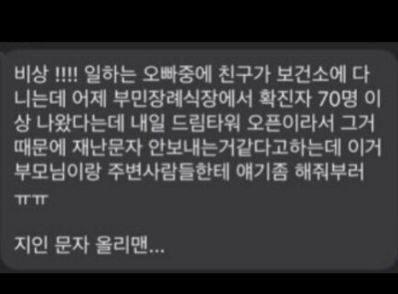 17일 오후 지역 커뮤니티 사이트를 중심으로 ‘O장례식장에서 70명의 대규모 확진자가 발생했다. 제주도 방역당국이 이를 숨기고 재난문자를 보내지 않고 있다’는 허위 내용의 메시지가 지역사회에 광범위하게 유포됐다.