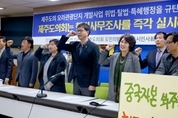 제주시민사회단체연대회의(‘연대회의’)는 4일, “제주도의회는 오라관광단지 개발사업 승인과정의 위법·탈법 및 특혜행정에 대한 행정사무조사를 실시해야 한다”며 “제주미래비전에 역행하는 오라관광단지 승인절차를 중단하라”고 촉구했다. 제주도정은 지난 3월 ‘제주오라관광단지 조성사업 환경영향평가서 협의내용 동의안’을 도의회에 제출했고, 도의회 환경도시위원회는 오는 6일 이 안건을 심의할 예정이다. 제주지역 18개 시민사회단체로 구성된 연대회의는 이 안건 심의를 앞두고 4일 오전 제주도의회 도민의방에서 기자회견을 열었다. 연대회의는 “오라관광단지 개발사업은 환경영향평가 절차 위반 논란과 지하 수 양도·양수 과정의 편법 특혜 논란을 시작으로 환경 및 경관, 하수·쓰레기, 논란이 제기되어 왔다”고 문제 삼았다. 그리고 올해 초 실시한 여론조사 결과 제주도민의 60%가 반대의견을 밝혔음에도 불구하고 원희룡 제주지사가 일방적으로 무시하고 있다며, “원희룡 지사의 이러한 행태는 도민의 상식과 인식을 넘어서는 행보”라고 날을 세웠다. 연대회의는 절차적 측면에서도 동의안 제출에는 큰 하자가 있다며 도의회가 환경영향평가 동의안을 부결시키고, 제주도정을 상대로 행정사무조사를