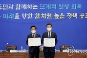 [제주교통복지신문 서유주 기자] 좌남수 제주도의회 의장과 구만섭 제주도지사권한대행이 코로나19 단계적 일상회복과 경제활성화를 위한 정책 공조 체제를 본격 가동한다. 좌남수 의장과 구만섭 도지사 권한대행은 이날 오전 10시 제주도청 본관 4층 탐라홀에서 상설정책협의회를 열고, ‘제주도-제주도의회가 도민들께 드리는 코로나19 위기 극복과 경제활성화를 위한 공동 합의문’을 발표했다. 올해 두 번째로 열린 상설정책협의회에서는 코로나19 장기화 속에 “제주사회의 안전망 확보 및 경제 활성화”와 특별자치도로서 “선도적 자치분권”실현을 통한 탄소중립 2030, 제주형 뉴딜 등 제주의 미래를 준비하고자 마련됐다. 좌남수 의장과 구만섭 도지사 권한대행은 정부의 단계적 일상회복 방침에 발맞춰 민간이 공동으로 참여하는 민관협력기구인 ‘코로나19 일상회복 범도민지원위원회’를 구성하여 선제적이고 포용적인 제주형 일상회복 조치를 마련하기로 합의했다. 또한 제주형 뉴딜 2.0 사업, 상하수도 인프라 확충 등 현안사업의 차질 없는 추진을 위해 ‘국비예산 확보단’을 공동 구성하여 2022년도 국비예산 확보에 총력을 기울이기로 했다. 특히 위기극복 및 경제 재도약을