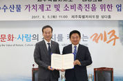 제주도는 청정 제주 수산물의 가공식품을 개발하고 PB상품 제작, 제주 수산물 홍보 등 제주 수산물의 소비촉진을 위한 제주도와 기업 간의 상생 협력을 위해 대명그룹과 업무 협약을 맺었다고 5일 밝혔다. 협약식에는 원희룡 도지사와 김계호 성산포수협 조합장, 김미자 서귀포수협 조합장, 김시준 한림수협 조합장, 이미남 모슬포수협 조합장, 김석영 제주도 수산물가공유통협회 회장, 박흥석 대명그룹 총괄사장, 유용희 ㈜대명코퍼레이션 대표, 이택상 ㈜대명레저산업 개발사업본부장 등 제주도와 대명그룹의 수산물 가공업체 관계자들이 함께 참석했다. 협약서에는 제주 수산물의 홍보 및 판로확대 지원을 통해 제주 지역 경제 발전에 기여할 수 있도록 상호협력 및 정보교류를 도모하는 내용을 명시했으며 지역 수산 가공업체의 수산 제품 개발 및 판매 지원에 대한 사항을 포함했다. 앞으로 업무협약 내용의 효율적 추진과 상호협의를 위해 제주도 관계자와 대명그룹 관계자, 가공유통업체 등이 함께 참여하는 실무협의회를 구성해 구체적인 실행방안을 수립할 예정이다. 원희룡 지사는 “대명그룹이 레저 산업의 전국 네트워크 경험을 살려서 제주의 식자재들을 활용한 식품, 상품들을 개발해서 판매를 하겠다고 나섰다