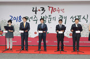 4·3 제70주년을 앞두고, 2018「제주 방문의 해」선포식이 도청 본관 앞마당에서 개최됐다. 제주도는 내년 4·3 70주년을 ‘제주방문의 해’로 정하고 4·3의 세계화를 위한 본격적인 기념사업을 시작한다고 5일 밝혔다. 2018 ‘제주 방문의 해’ 선포식에는 원희룡 도지사를 비롯해 4·3 70주년 범국민위원회, 4·3 70주년 기념사업위원회, 4·3희생자 유족회 등 500여 명이 함께 참석했다. 또한 선포식에는 도외에서 4.3알리기에 힘쓰고 있는 ‘제주 4.3 70주년 범국민위원회’대표단 20여명이 함께 참석함으로써 4·3을 화해·평화·인권의 가치로 승화, 발전시키기 위한 노력이 가시화 되고 있음을 보여줬다. 선포식은 4·3 제70주년 범국민위원회 박찬식 운영위원장의 경과보고와 함께 2018 제주 방문의 해 추진 취지 설명이 이뤄졌다. 원희룡 도지사, 신관홍 도의회 의장, 이석문 교육감, 정창수 한국관광공사 사장, 정연순 4·3범국민위원회 상임공동대표, 양윤경 제주4·3희생자유족회장의 공동선언문 낭독이 이어졌다. 이어서 4.3의 상징인 동백꽃 우산을 이용한 퍼포먼스로 진행됐다. 원희룡 도지사는 “4·3에 대한 국민의 관심과 참여는 4·3 해결 과정에서 얻은