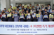 제주4·3의 완전한 해결을 위해 제주도를 비롯한 행정기관과 4·3단체, 원내정당, 시민단체 등이 한자리에 모여 제주4·3특별법 개정안 통과에 뜻을 함께하기로 결의했다. 제주도는 지난 15일 오후 1시 도의회 앞 광장에서 전국 124개 단체들이 참여한 가운데 ‘제주4·3특별법 개정 쟁취를 위한 공동행동 기자회견’을 개최했다고 밝혔다. 이날 기자회견은 제주4·3특별법 개정안의 조속한 통과를 위한 민관 합동 의지를 표명하기 위해 마련됐다. 공동행동에는 제주도내 행정기관*, 원내정당**, 시민단체*** 등을 비롯해 (사)한국민예총 등 도외 시민단체들도 함께 참여했다. *행정기관: 제주도, 제주도의회, 제주도교육청 **정당: 더불어민주당·미래통합당·정의당 제주도당 ***시민단체: 제주4·3희생자유족회, 제주주민자치연대, 제주참여환경연대 등 원희룡 제주도지사는 “21대 국회의 출범에 발맞춰 4·3특별법 개정이 새로운 출발선에 섰다”며 “이번 공동행동이 4·3에 대한 전 국민의 관심과 지지를 이끌어 내고 국민들과 함께 4·3특별법 개정을 위한 힘찬 발걸음을 함께 하는 계기가 되길 바란다”고 강조했다. 또한 “21대 국회에 맞춘 일종의 통과요구 선전포고이자 도민들에게는 4