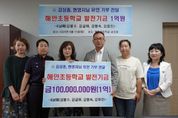 [제주교통복지신문 박희찬 기자] 제주도교육청 해안초등학교에서는 11일 교장실에서 해안동이 고향인 4남매(강봉수, 강형숙, 강금여, 강효진)로부터 기탁받은 학교발전기금 1억 원 전달식을 가졌다. 지난해 돌아가신 부모님(故 강상종, 현영자)께서 생전에 해안초등학교 발전과 저소득층 및 다자녀 가정 학생들을 위해 기부하고 싶다는 말씀을 남기셔서 4남매가 서로 의논하여 선뜻 1억을 기부했다. 기부자인 4남매는 모두 해안분교를 졸업했다. 어려웠던 가정 환경에도 불구하고 모두가 훌륭하게 성장한 데는 학교의 도움이 컸다며 학교에 조금이나마 보탬을 줄 수 있어 기쁘다는 소감을 밝혔다. 해안초등학교 관계자는 “부모님과 4남매의 학교 사랑의 마음을 해안초 학생들에게 잘 전달하고 훌륭한 인재로 키우는 데 최선을 다하겠다”라며 감사의 뜻을 전했다.