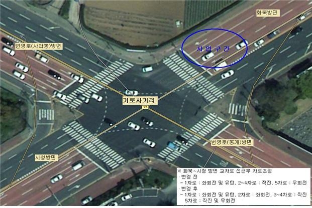 이번 사업은 거로사거리 화북에서 봉개 방면 좌회전 대기차량 정체를 해소하기 위한 것으로 기존 1차로 좌회전 및 유턴, 2~4차로 직진, 5차로 우회전으로 운영되던 것을 1차로 좌회전 및 유턴, 2차로 좌회전, 3~4차로 직진, 5차로 직진 및 우회전 차로로 변경하는 것을 골자로 한다.