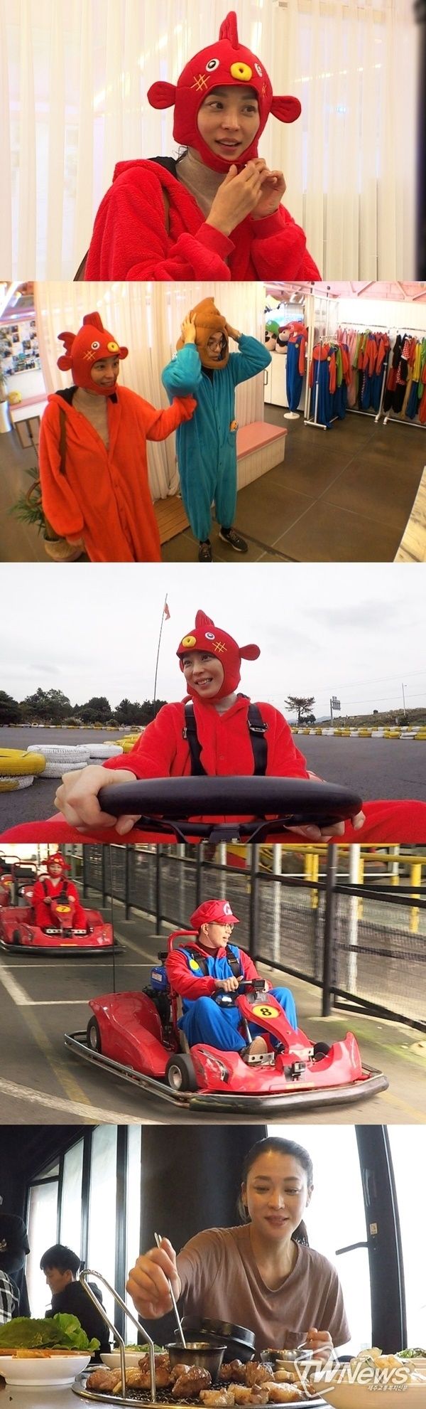 카트장에 도착한 한고은-신영수 부부는 레이싱을 즐기기 전, 다양한 캐릭터 옷을 입어보며 만반의 준비를 했다. 한고은은 캐릭터 옷을 착용하며 “배우 인생에 이런 옷 처음 입어봐”라고 말했고, 이를 스튜디오에서 지켜보던 스페셜 MC 윤해영은 “퍼레이드 하는 것 같아요”며 농담을 건넸다. 이에 자신의 모습을 VCR로 지켜보던 한고은은 “어머 저 왜 이러죠?”라며 깜짝 놀라는 모습을 보여 웃음을 자아냈다.