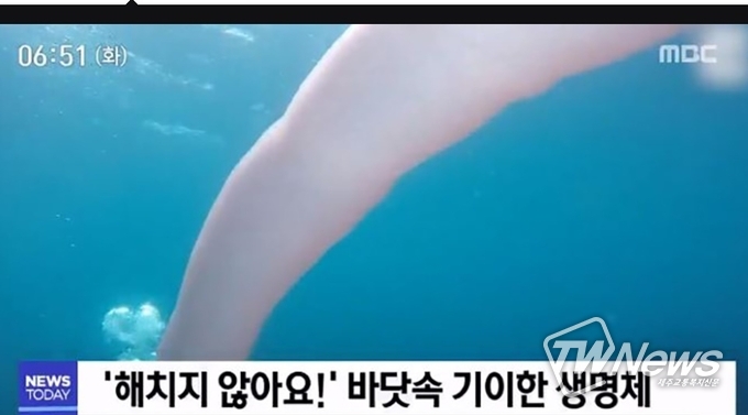 이를 인용한 국내 언론보도에 따르면 스티브 해서웨이(56)와 앤드루 버틀(48)이 뉴질랜드 화이트 섬 부근에서 스쿠버 다이빙을 하던 중 흰색의 거대한 생명체를 목격했는데, 이들은 바다 수심 약10m 지점에서 길이가 8m쯤 되는 이 생명체가 느린 속도로 200m가량 이동하는 과정을 지켜보다가 조심스레 쫓아다녔다고 밝혔다.