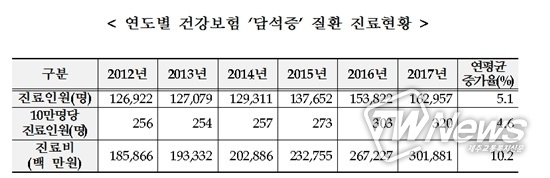 '담석증' 질환으로 지출된 연간 진료비는 2012년 1,859억 원에서 2017년 3,019억 원으로 연평균 10.2% 증가했고, 남성보다 여성에게서 많이 발생했다.