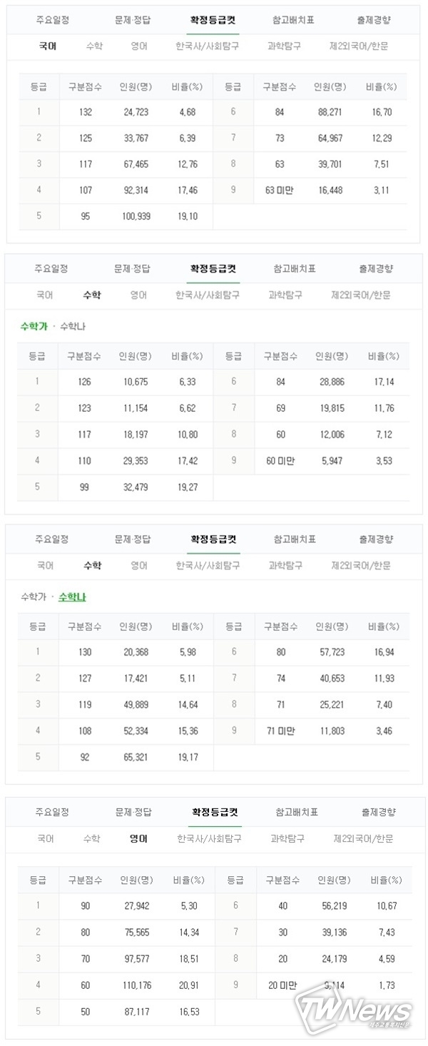 이에 따르면, 국어 1등급은 원점수 기준 84점, 영어는 90점, 수학 가형 92점, 수학 나형 88점이다.