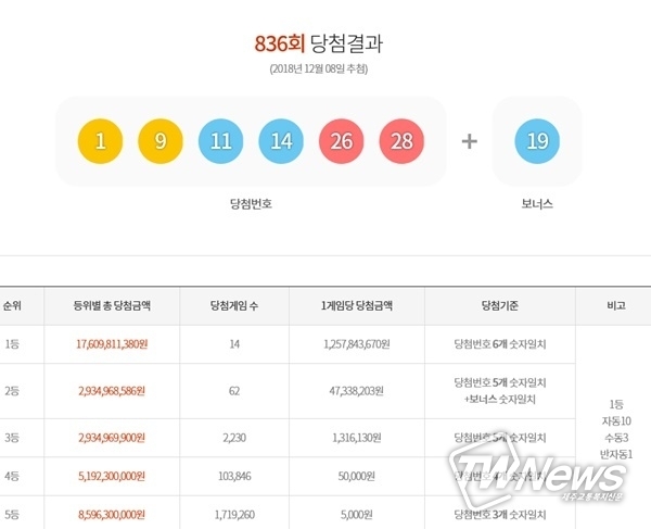 반대로 3명이 서울에서 당첨되는 등 로또836회당첨번호는 여전히 관심 1순위로 등극했다.