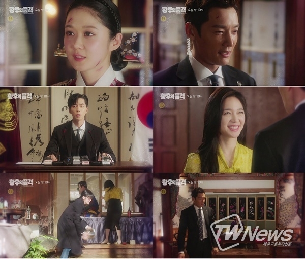여기서는 이혁(신성록 분)이 언론과 긴급기자회견을 자청, 국민들을 향해 사죄하면서 시작된다. 하지만, 고개를 숙인 그의 입가에는 알듯 모를듯한 미소가 엿보이더니 이내 유라와 다시 한 번 밀회를 즐기며 “민유라를 황후의 자리에 앉히겠습니다”라고 선언했다.