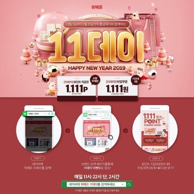 위메프가 2일 오전 11시부터 오후 12시 59분까지 2시간 1원 이상 구매시 1,111 포인트를 지급하는 쿠폰을 무제한 발급한다고 밝혔기 때문.