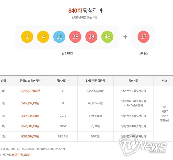로또840회당첨번호 결과, 1등의 행운을 만끽할 번호는 2 4 11 28 29 43으로 ‘연속번호’의 행운은 이번에도 등장했다.