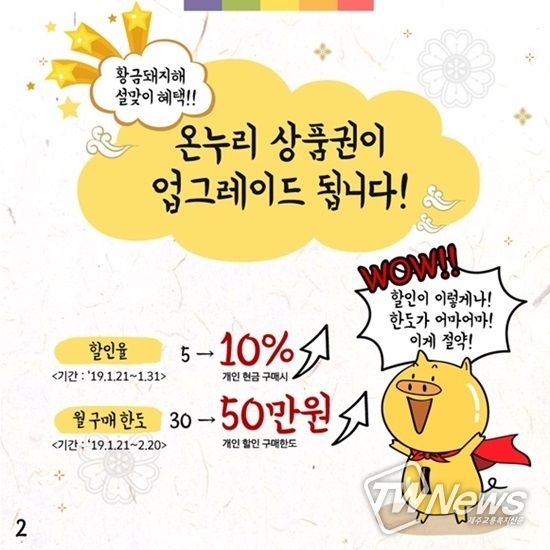 한편 중소벤처기업부는 설 명절을 앞둔 오는 31일까지 이 상품권 개인구매 시 할인율을 현재 5%에서 10%로 확대하고, 월별 할인구매 한도금액도 현재 30만원에서 50만원으로 확대한다.