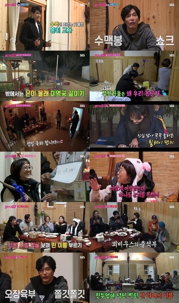 이날은 생일을 맞은 송은이를 위해 그녀 몰래 생일상을 준비하느라 모두들 일사분란하게 움직였다. 지난주 ‘칡캐기’에 성공한 심마니 삼형제 구본승x김부용x최민용은 선물용 ‘칡’을 숨기기에 바빴고, 김도균은 은이를 밖에 못나오게 하는 감시조에 합류했다. 최성국은 영하의 추위에도 불구하고 야외에서 직접 미역국을 끓이는 정성을 보였다. 더불어 청춘들이 스케치북에 손수 적은 축하 문구로 릴레이 편지를 쓰는 이벤트도 준비했다.