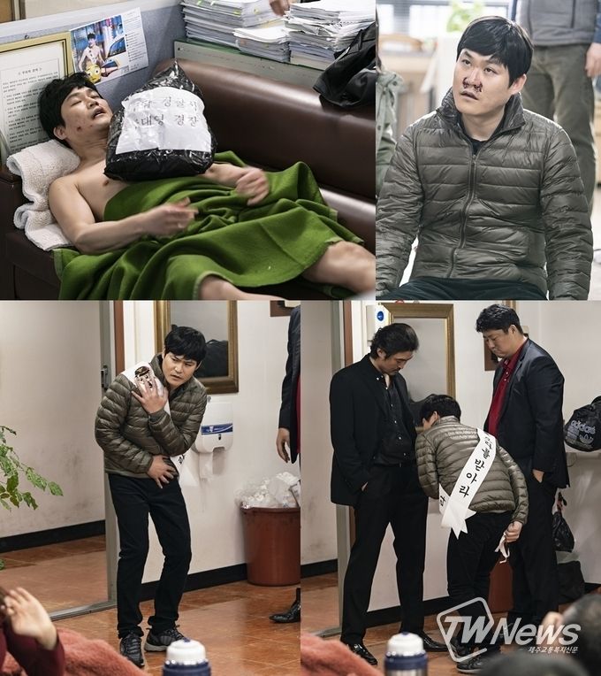 공개된 사진에는 구대영 형사의 굴욕 가득한 일상들이 담겨 있다. 가장 먼저 경찰서 소파 위에 뻗어 있는 구대영의 모습이 눈에 띈다. 옷은 어디에 벗어놓은 것인지, 구대영은 알몸에 이불만 덮은 채 곯아떨어져 있다. 쌍코피를 흘리고 있는 구대영의 모습도 시선을 강탈한다. 잠시도 몸이 성한 적 없는, 험난한 구대영 형사의 일상이 폭소를 유발한다.