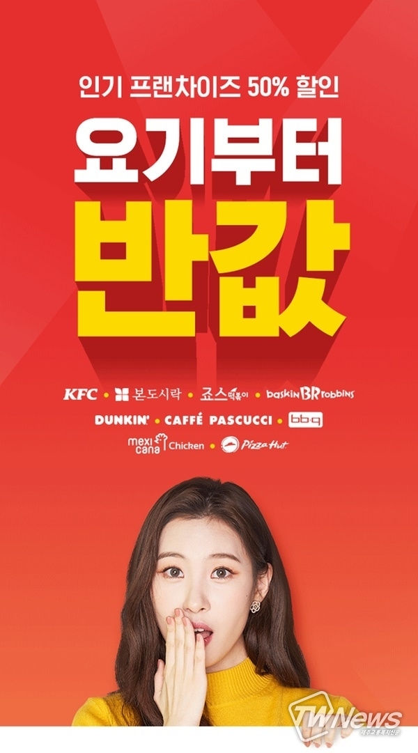 이 브랜드가 인기 프랜차이즈 50% 할인에 들어간다. 이에 따라 불금에 맞춰 탁자 가득 음식을 펼쳐놓는 듯한 그림이 그려지고 있다.