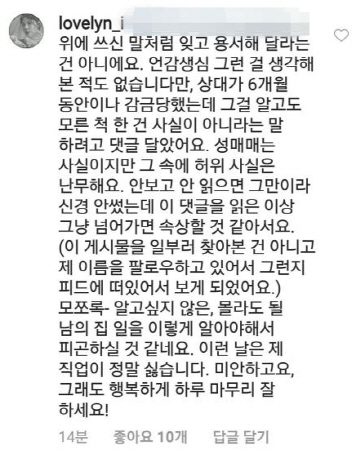 즉, 남편이 '미성년자인지 몰랐다'는 기존의 입장을, 아내인 린 가수가 다시 한번 되풀이하면서 '성매매는 인정하되' 미성년사 성매매는 허위사실이라고 다시 한번 단정을 지은 형국이다.