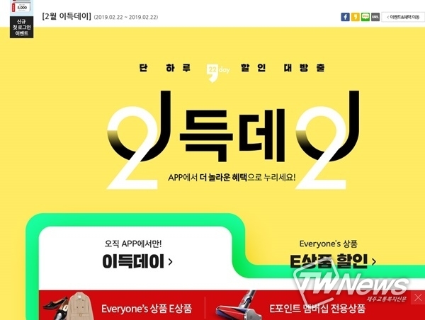 이랜드몰이 오늘을 '이득데이'라고 규정, '즉시 이득' '선착순 한정이득' 등의 표현구로 소비자들을 유혹하고 있는 것.