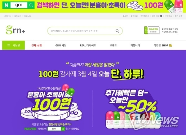이른바 '분홍이 초록이 다이어트'로 업계에 신드롬을 일으킨 grn 브랜드가 4일 '단 하루' 선착순에 한해 '100원 행사'를 진행하기 때문.