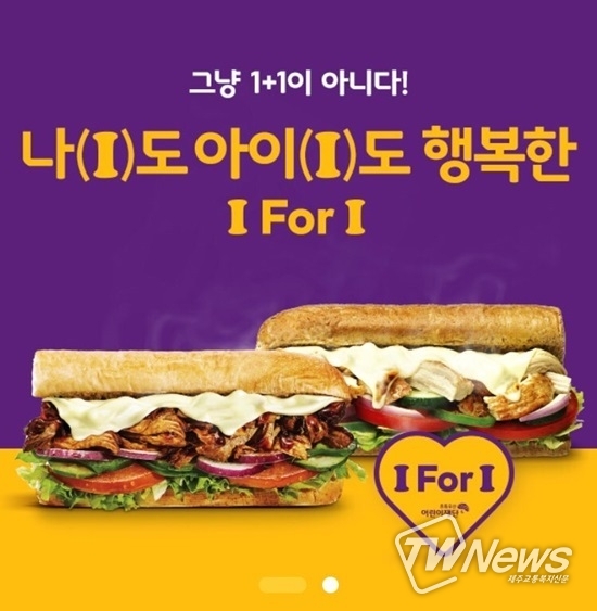 15cm 샌드위치 구매시 동일 제품을 하나 더 주는데, 프로모션 수익금 일부가 초록우산어린이재단에 기부 된다.