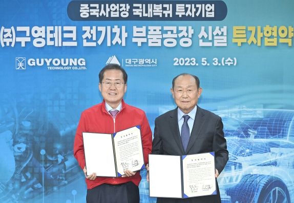 [제주교통복지신문 김강석 기자] 대구광역시는 5월 3일 오전 11시 30분 대구광역시청 산격청사에서 ㈜구영테크와 대구국가산업단지 내 전기차 부품 제조공장 신설을 위한 투자협약을 체결했다.