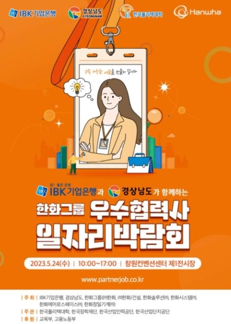 [제주교통복지신문 김강석 기자] 한국폴리텍대학(이사장 직무대리 임춘건,‘폴리텍’)은 오는 24일 창원컨벤션센터 제1전시장에서 IBK기업은행, 경상남도, 한화그룹과 함께 ‘한화그룹 우수협력사 일자리 박람회’를 연다고 3일 밝혔다.