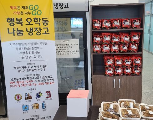 “오학동 행복 나눔 냉장고”는 오학동 주민들이 자발적으로 기부한 물품을 복지 사각지대에서 어려움을 겪고 있는 이웃들에게 공유와 나눔을 통해 행복한 오학동을 실천하기 위해 매주 화요일 운영하고 있다.